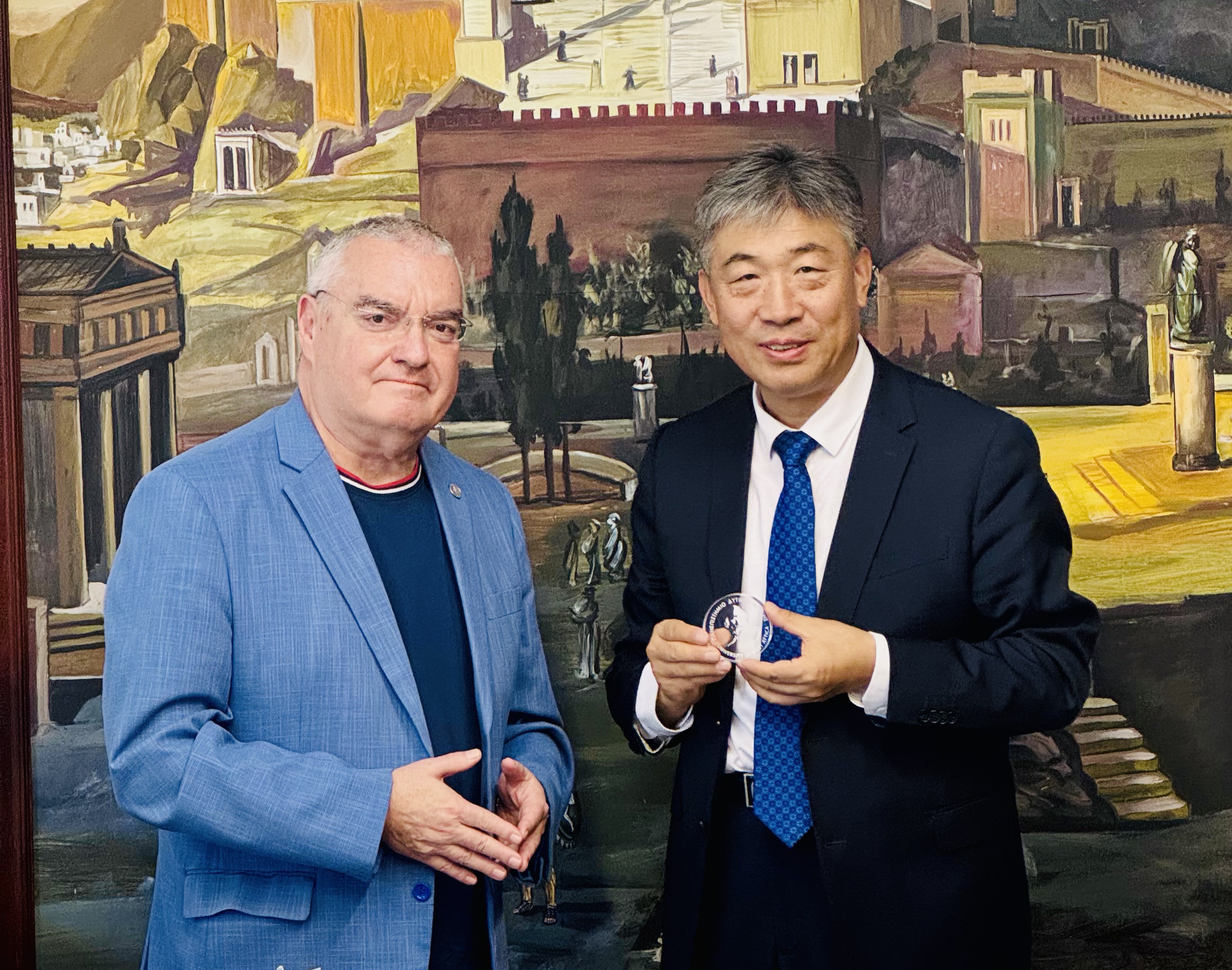 在雅典访问期间,司林胜与西阿提卡大学校长帕纳尤蒂斯·卡蒂斯会晤。司林胜表示,两校在合作和互访中建立了深厚友谊,未来将继续以多种形式推动合作办学、深化区域国别研究、增进中希文明交流互鉴。卡蒂斯代表学校表达了希望与我校深入合作、推动双方师生交流交换与科研协同创新的良好愿望。会谈后,代表团实地走访该校经济与社会科学学院、工程学院、学生科创工作室等教育教学场所。